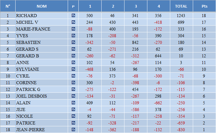 La soirée a été remportée par Nicole qui, une fois n’est pas coutume, a réussi à devancer sur le podium Joël et Jean-Paul P. Tous les résultats ci-dessous.