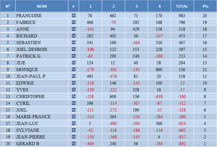 Hélas, l’ordinateur récalcitrant du club n’étant pas sur la même ligne, il a fallu que Marie-France fasse tous les comptes à la main. Merci à elle pour cette performance d’un autre siècle !