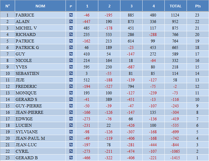 Peu de commentaires sur le tableau des résultats de cette soirée de vendredi 13 qui a été remportée par Sébastien (joli score de 1302 pts), suivi à distance respectueuse par Joël (766 pts) et par Gérard B (520 pts).