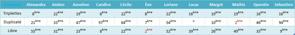 Monteront également sur le podium : Ève (2ème en donnes libres benjamin·e·s) et Marie-France (2ème du tournoi des accompagnateurs). Décidément, la 2ème place était à l’honneur cette année… Bravo à tous !