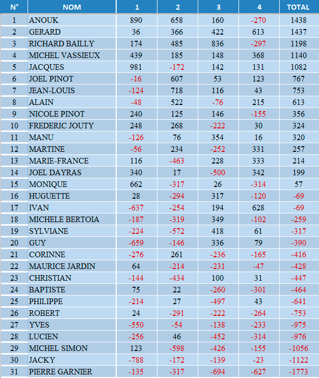 Dans le tournoi en donnes libres de l’après-midi, Marie-France s’est brillamment imposée et a fini 1ère avec 2430 pts. Martine a terminé 14ème, Jacques 19ème, Sylviane 45ème, Anouk 46ème, Joël B. 53ème et Richard L. 57ème.