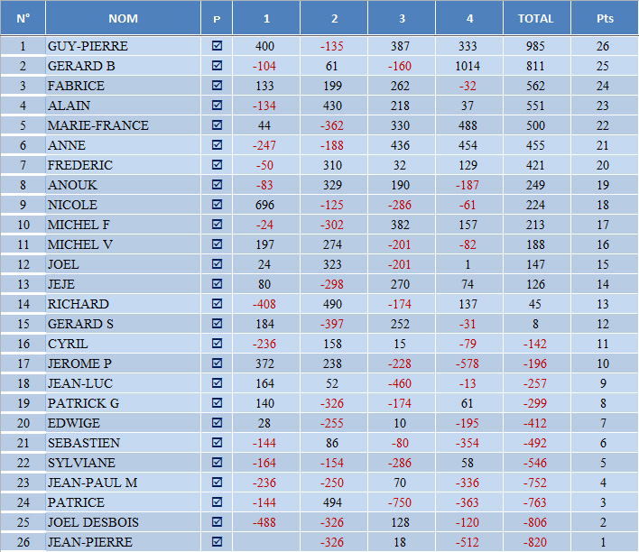 À l’issue des 24 donnes, on retrouve Guy-Pierre sur la 1ère marche du podium. Il est suivi par Gérard B. qui a réussi une dernière table de folie (1014 pts). Fabrice complète ce podium très masculin. Mention spéciale à Edwige et Jéjé que le tirage au sort a permis de récompenser.