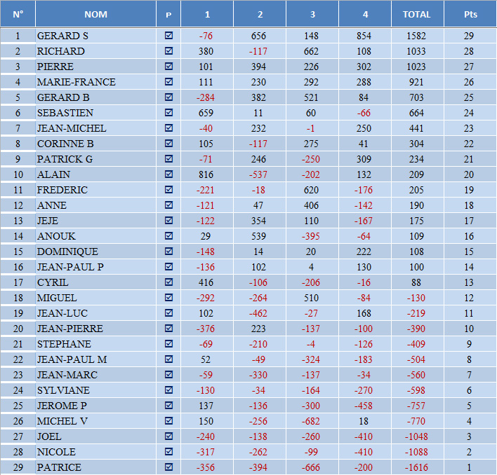 Quant au challenge proprement dit, on remarquera que les favoris étaient au rendez-vous. Grâce à une 4ème table de folie, Gérard S a pu se hisser sur la 1ère marche du podium. Ensuite on trouve Richard (encore lui !) qui est suivi de très très près par Pierre.