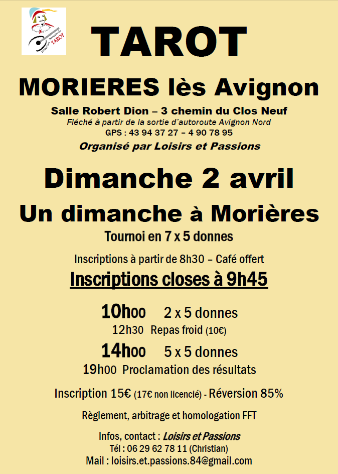 L’association Loisirs et Passions a organisé un tournoi en 7 x 5 donnes ce dimanche 2 avril à Morières-lès-Avignon. Celui-ci a réuni 79 joueurs venus de tout le Vaucluse.