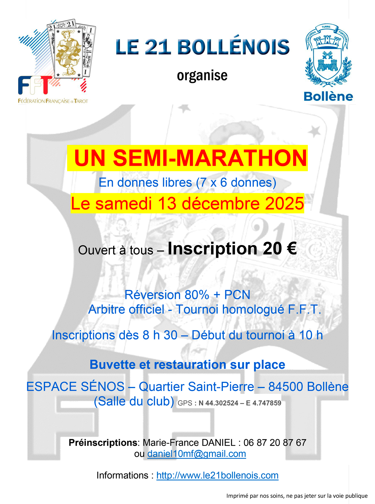 • Pour le semi-marathon du samedi 13 à 10 h, prière d’utiliser les parkings à proximité de l’Espace Sénos mais ne surtout pas se garer devant le bureau de tabac (risque important de PV).