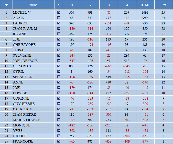 Bravo à tous pour la participation à l’ambiance décontractée de cette soirée. Rendez-vous vendredi prochain avec, pour ceux qui le souhaitent, un entrainement duplicaté à 18 h 30 et le challenge de février à 20 h 30 (participation 5 €).
