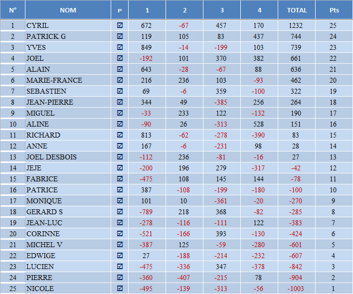 La soirée fut très conviviale comme d’habitude, avec son lot de satisfactions et de déceptions. À la fin, on obtient un podium très viril avec la belle prestation de Cyril (1232 pt) qui a largement distancé Patrick et Yves.